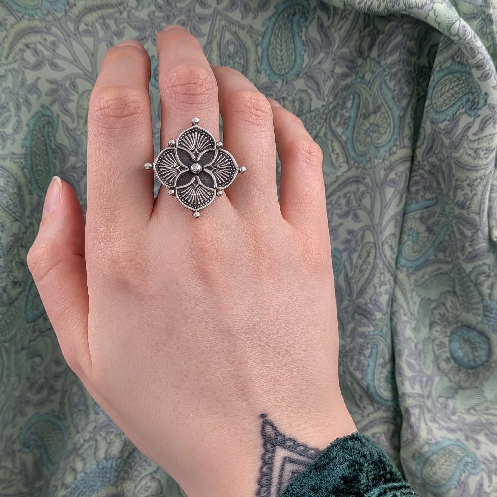 >> all silver flower ring with handstamped details
